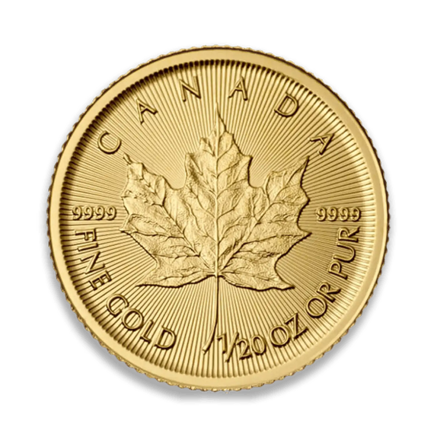 The Canadian Gold Maple Leaf is a gold bullion coin produce by the Royal Canadian Mint. This coin is renowned for its .9999 purity, authenticity and beauty. The 1/20 oz Canadian Gold Maple Leaf coin is a great gold investment and contains one twentieth (1/20) of a troy ounce of gold.