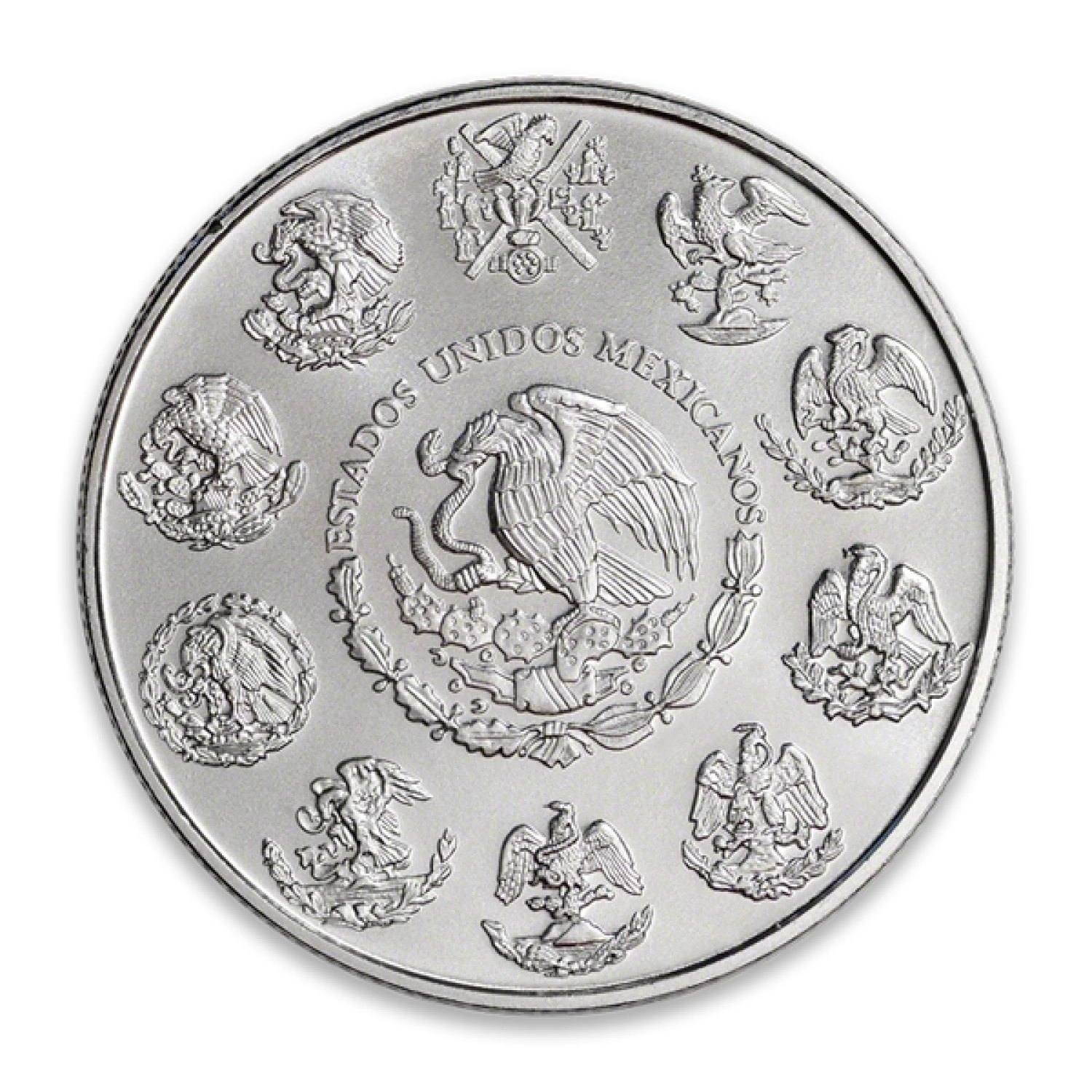 A winged Victoria of Mexican Independence Victory Column in front of a landscape with the volcanoes Popocat’petl and Iztaccihuatl graces the front, while the reverse contains the coat of arms of Mexico surrounded by historical mexican coats of arms. The Mexican Libertad design has changed over the years. Some investors refer to this Mexican silver coin as the Mexican Onza while others call it the Mexican Libertad. They are one in the same coin.