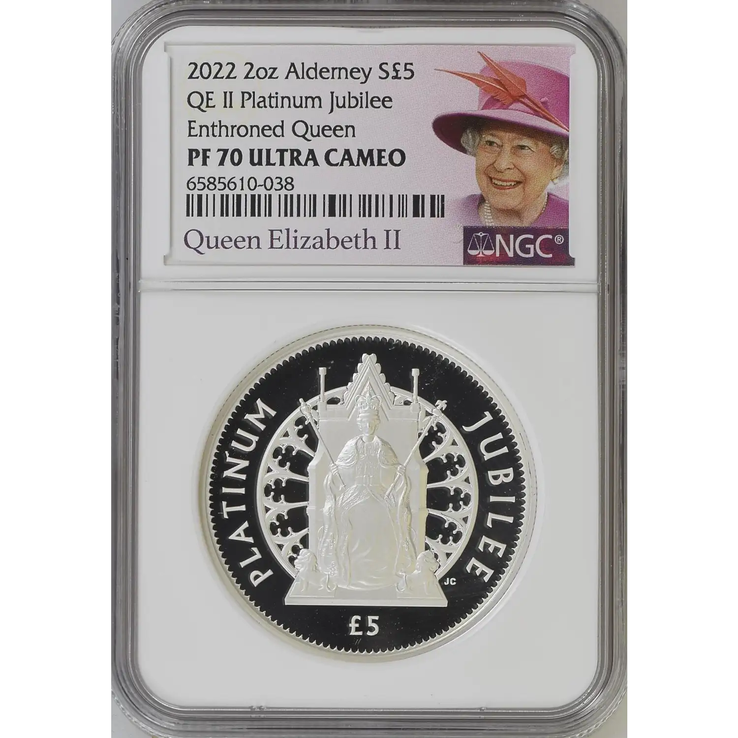 Celebrate a once-in-a-lifetime royal milestone with this exquisite 2022 $5 Platinum Jubilee "Enthroned Queen" 2 oz Silver Coin, struck in .9999 fine silver and graded a flawless NGC PF70 Ultra Cameo.