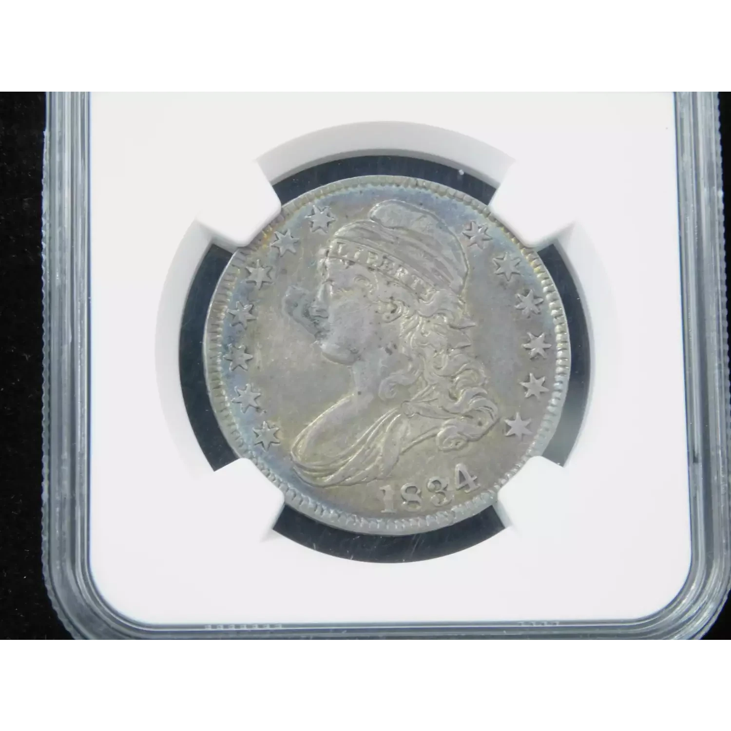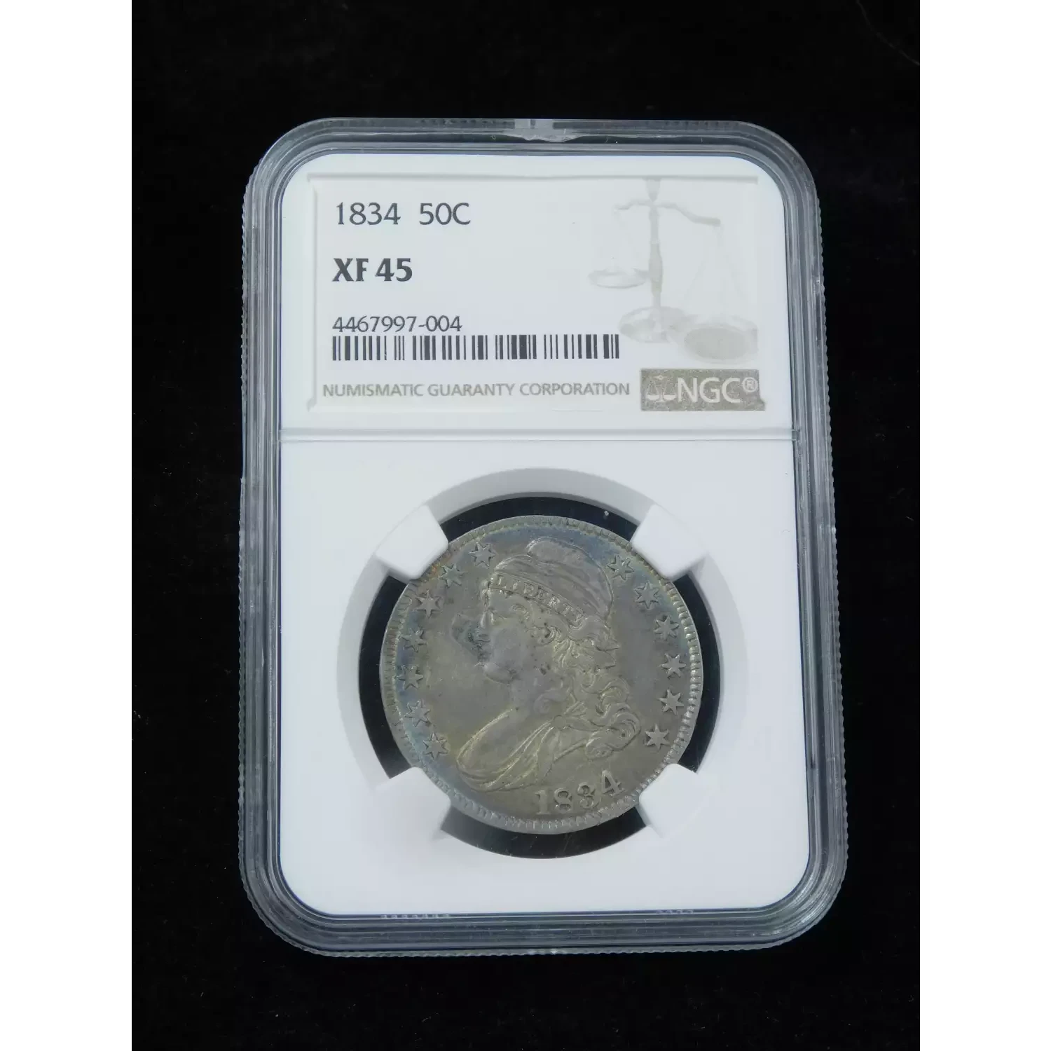 Here is a distinguished example of early American coinage: an 1834 Capped Bust Half Dollar, O-107 variety, certified NGC XF45 and exhibiting handsome natural toning that enhances its vintage appeal.