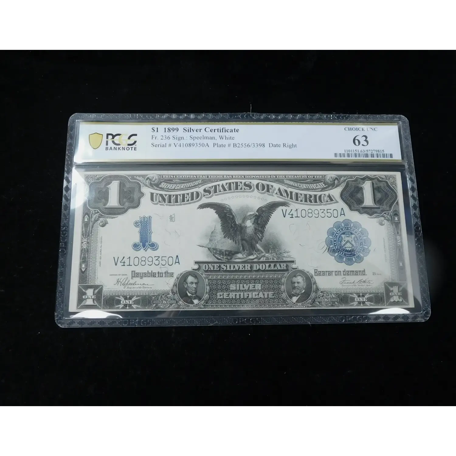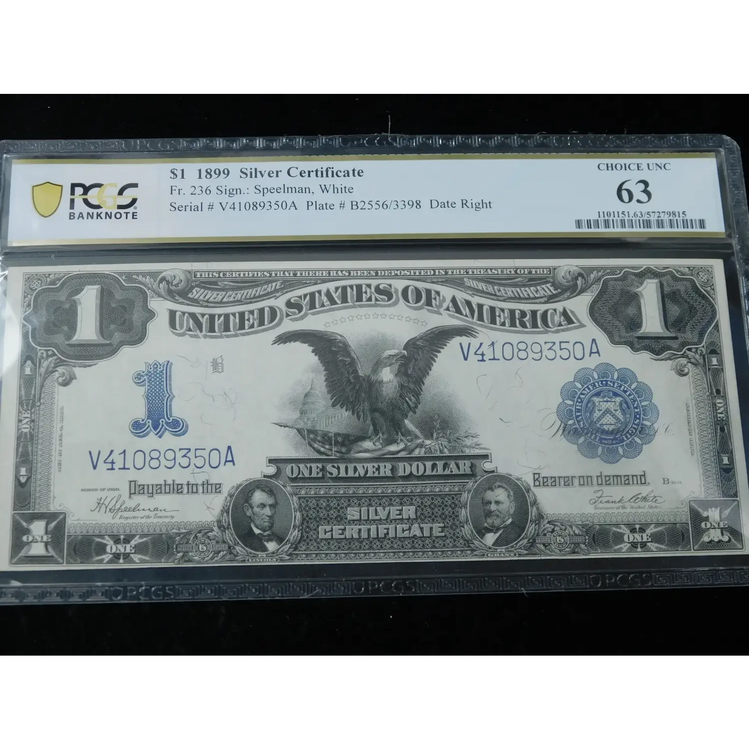 This classic 1899 $1 Silver Certificate, known as the famous “Black Eagle”, is one of the most iconic and widely recognized designs in U.S. paper money history. Graded Choice Uncirculated 63 by PCGS, this note boasts crisp paper, bold inks, and excellent overall eye appeal.