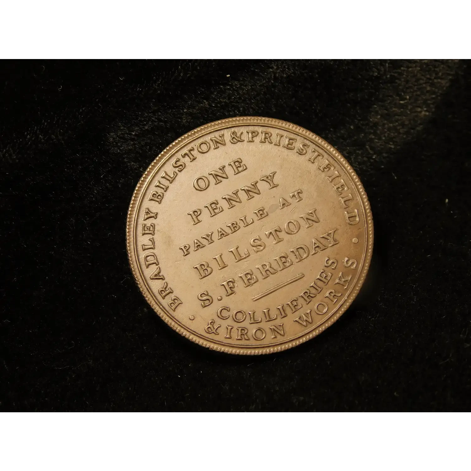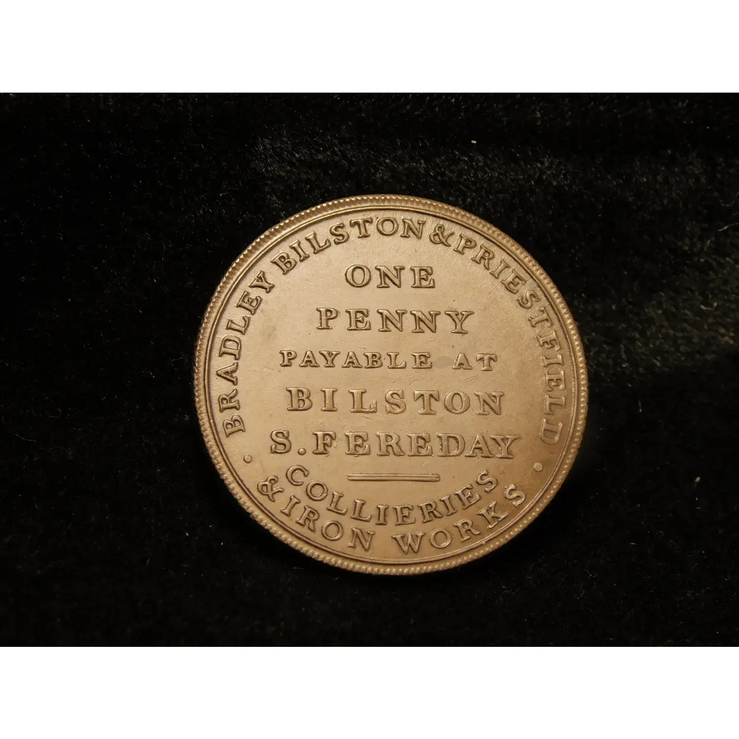 The obverse features a detailed depiction of Bilston’s blast furnaces, reflecting the industrial pride of the area, accompanied by a surrounding legend identifying the town and issuer. The reverse often includes additional local or commercial inscriptions, providing context for its circulation and the trade practices of the time.