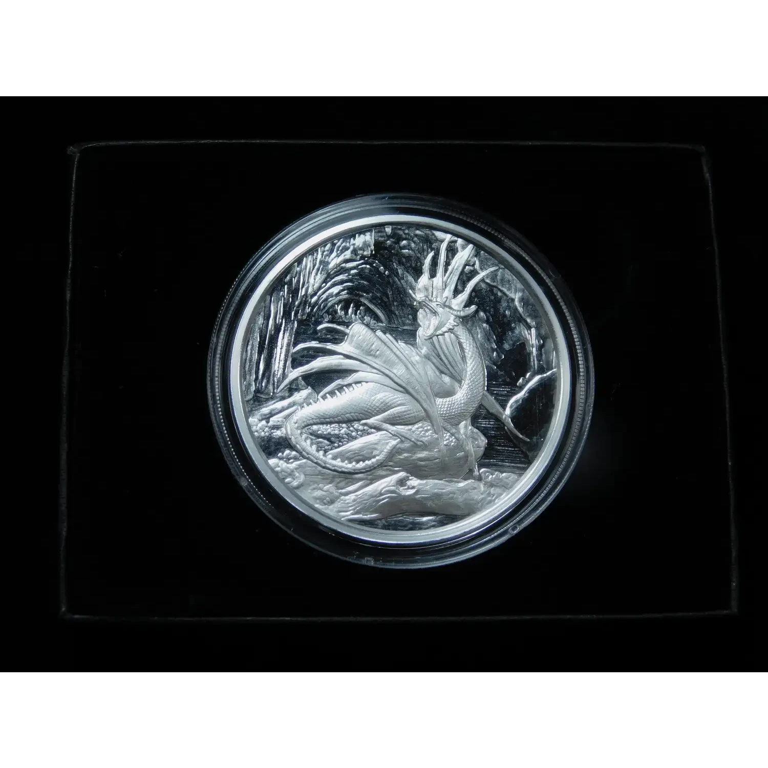 The obverse displays a dynamic, intricately detailed dragon, capturing the fierce energy and mythic elegance of Nordic legend. The reverse features the standard silver round markings, including weight, purity, and denomination details. Each round comes with its original display box and Certificate of Authenticity (COA), ensuring both provenance and collectible value.