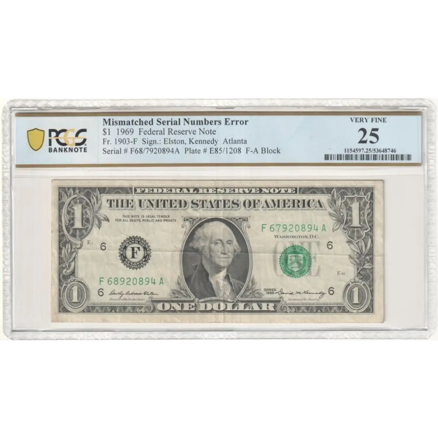1969 $1 Federal Reserve Note w/ Mismatched Serial Numbers - PCGS VF25