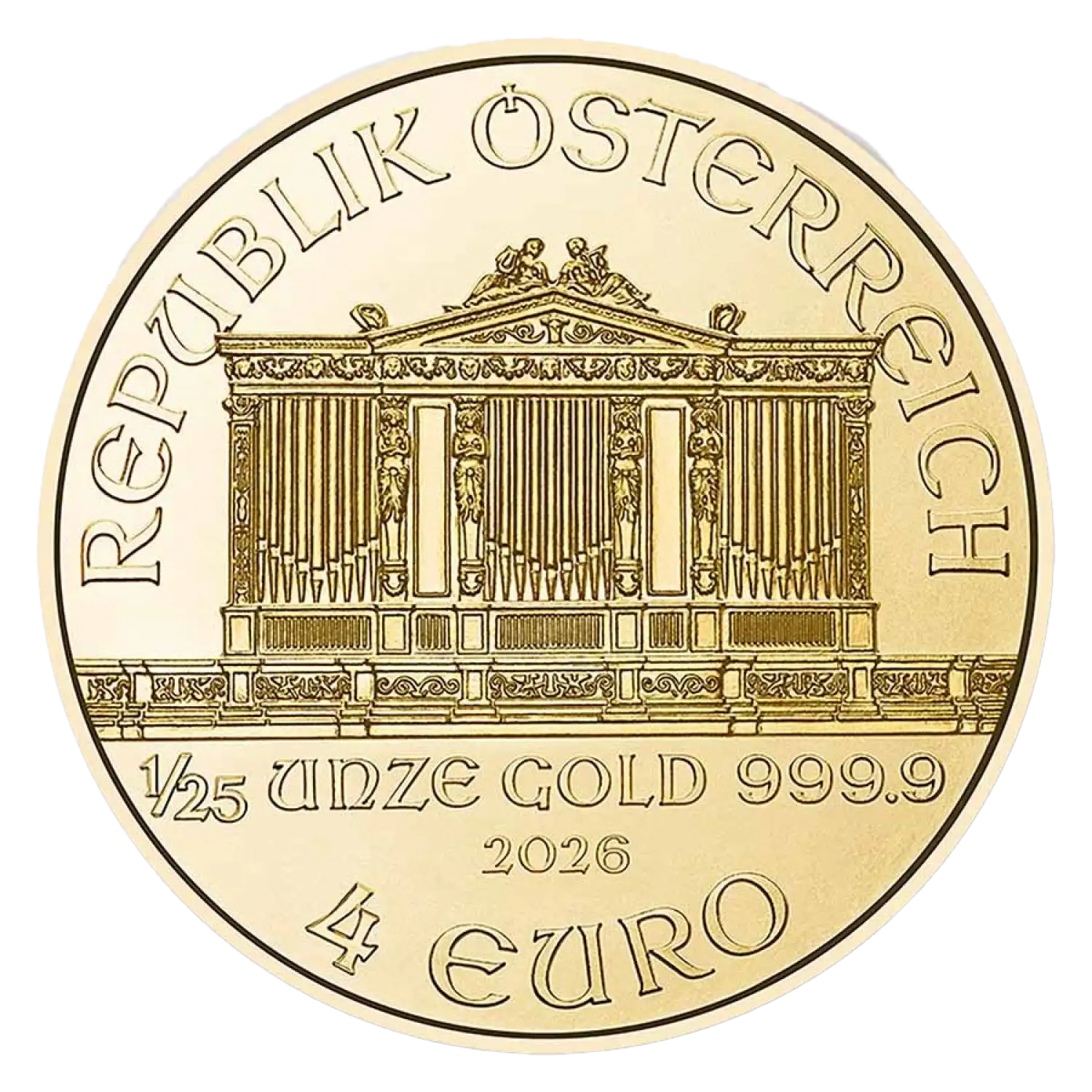 The 2026 1/25 oz Austrian Gold Philharmonic coin is a stunning example of craftsmanship and a valuable addition to any collection or investment portfolio. Renowned for its exquisite design and gold purity, this coin not only represents a piece of Austrian culture but also a sound investment in precious metals. Minted by the esteemed Austrian Mint, the Philharmonic series has become a favorite among collectors and investors alike due to its beautiful artistry and high quality.