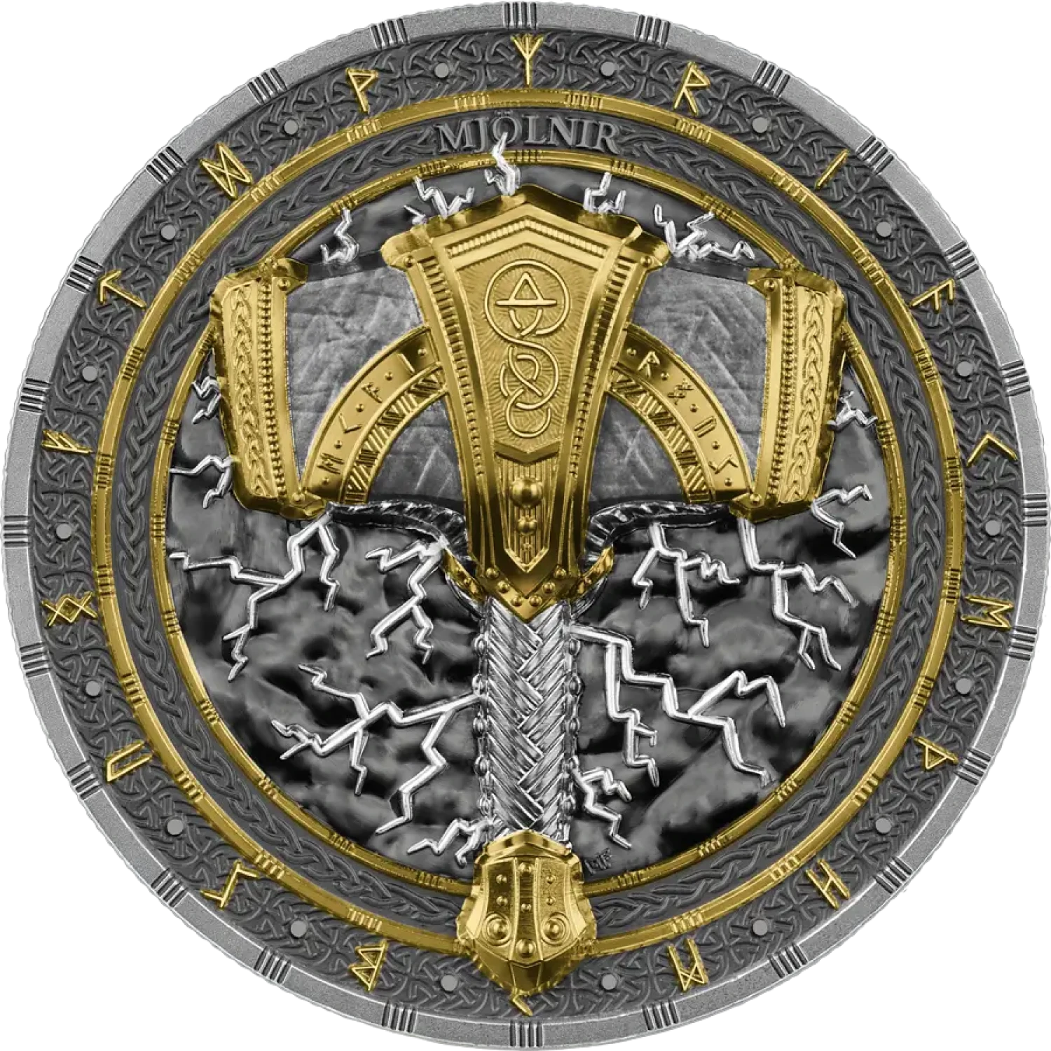Here are the key specifications for the 2025 2 oz Artefacts: Mjölnir Silver Coin: