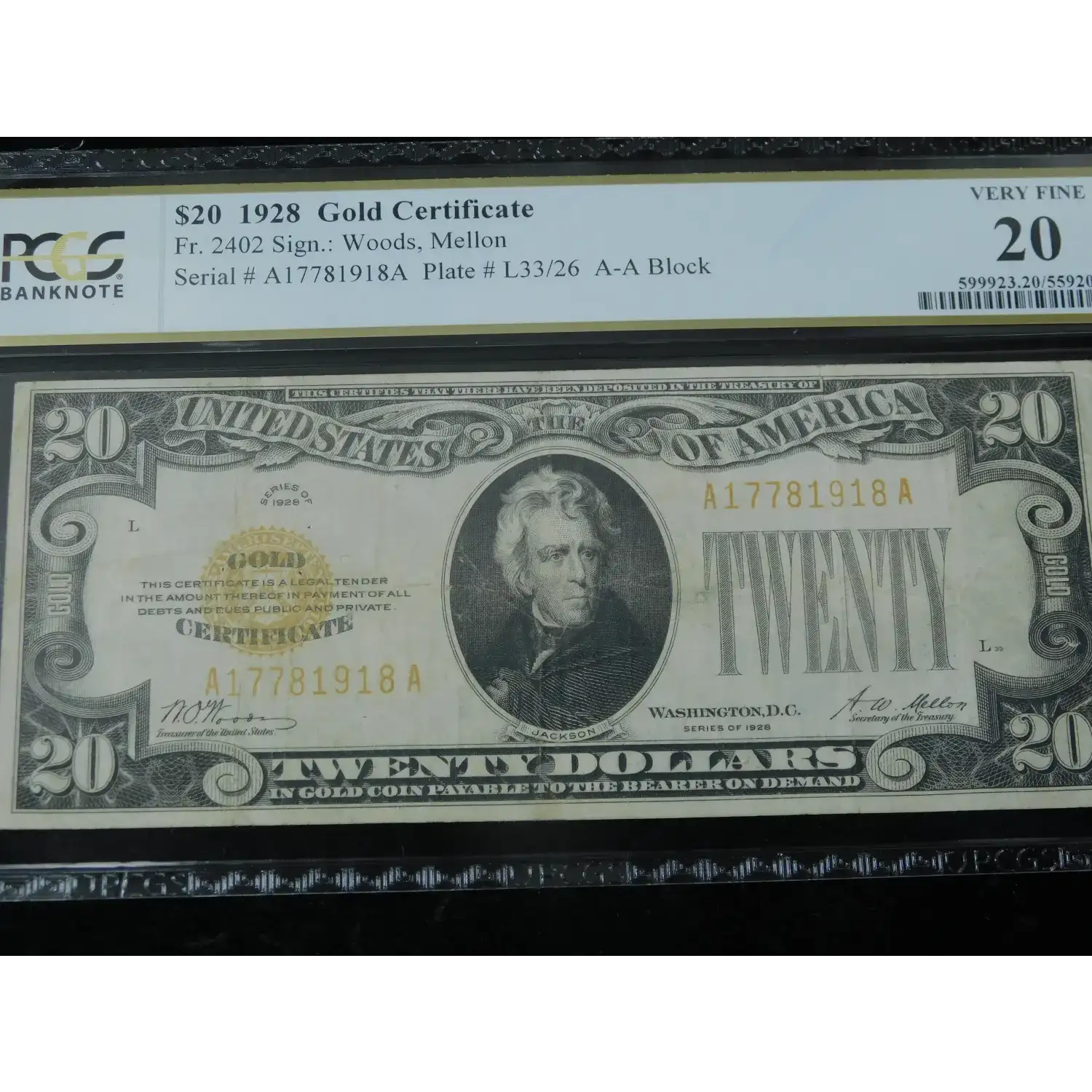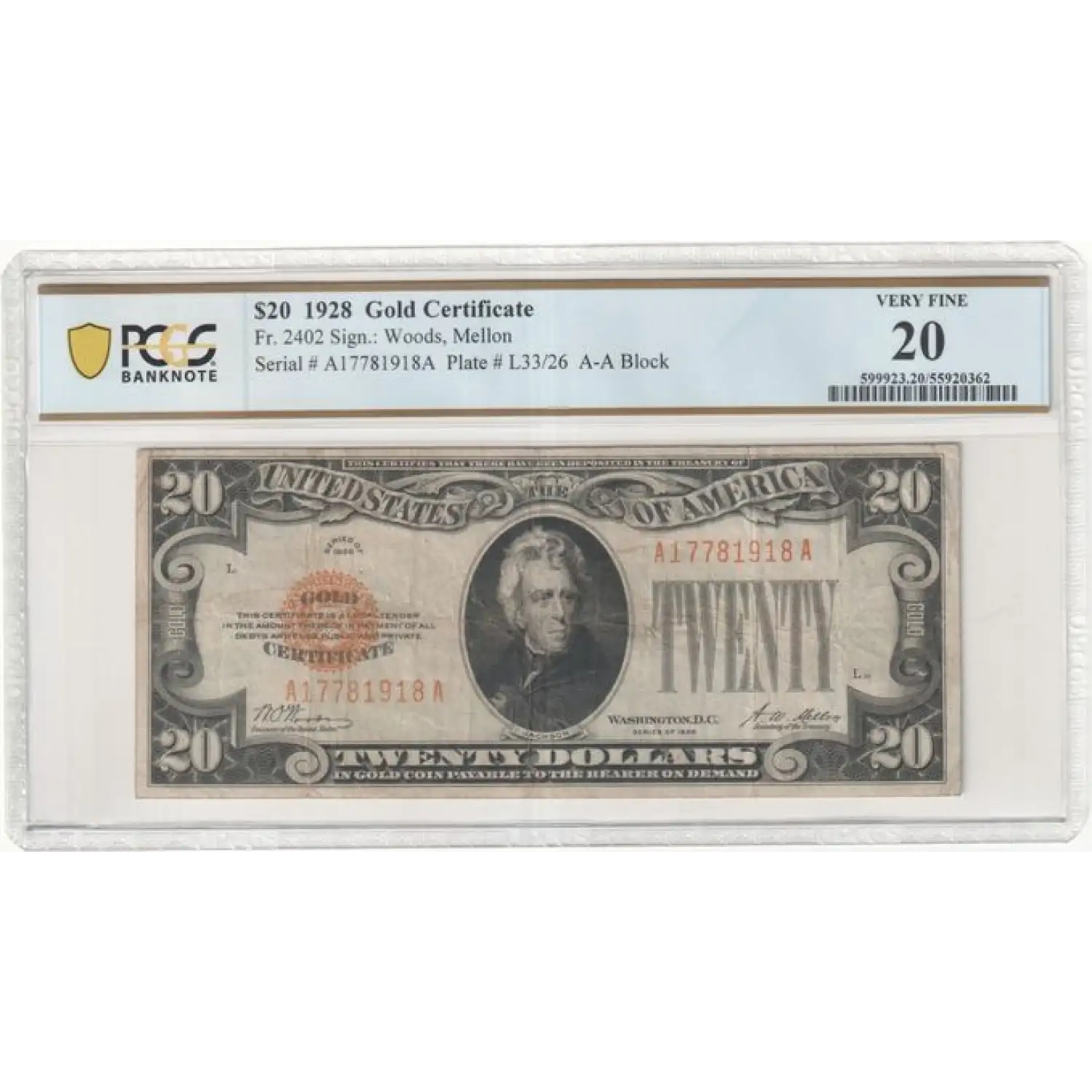 1928 $20 United States Gold Certificate AA Block Fr. 2402 - PCGS 20