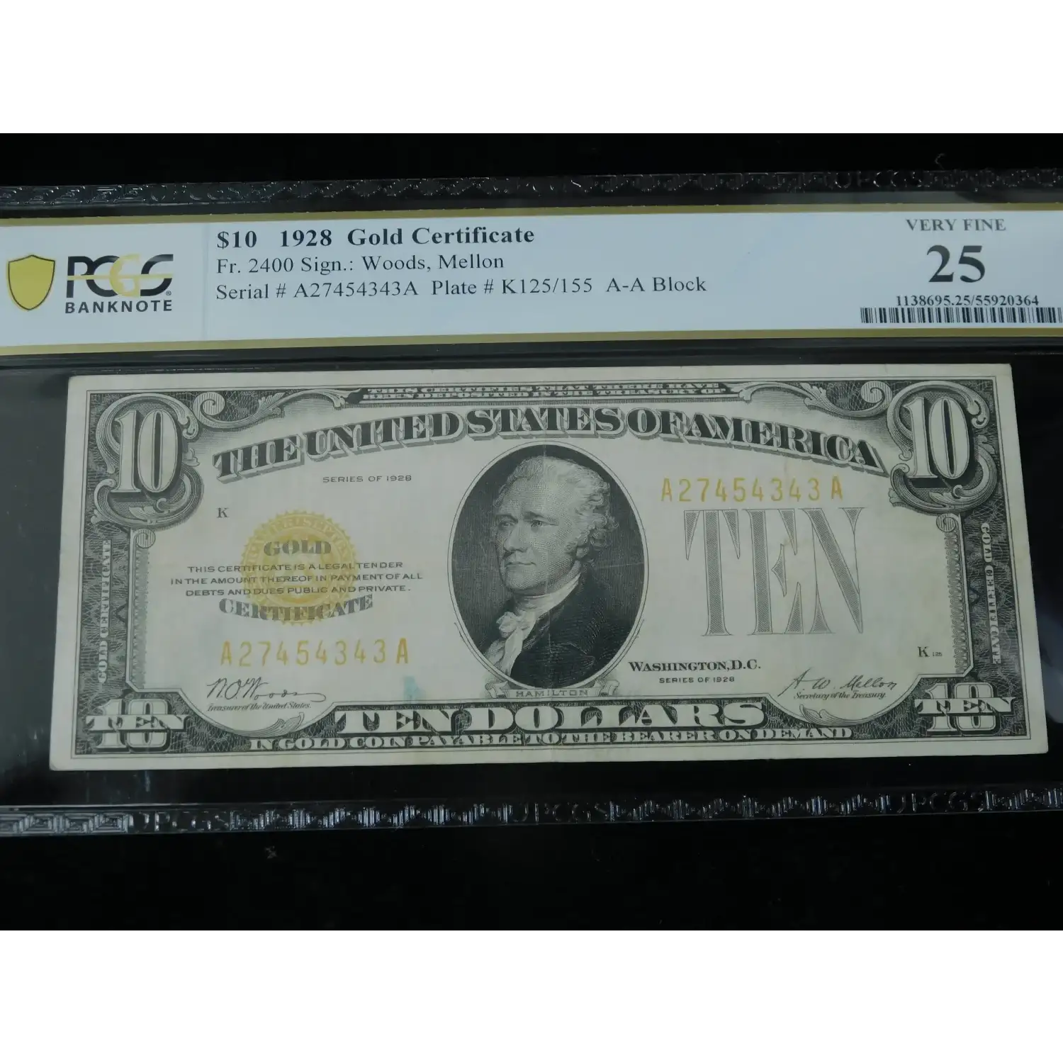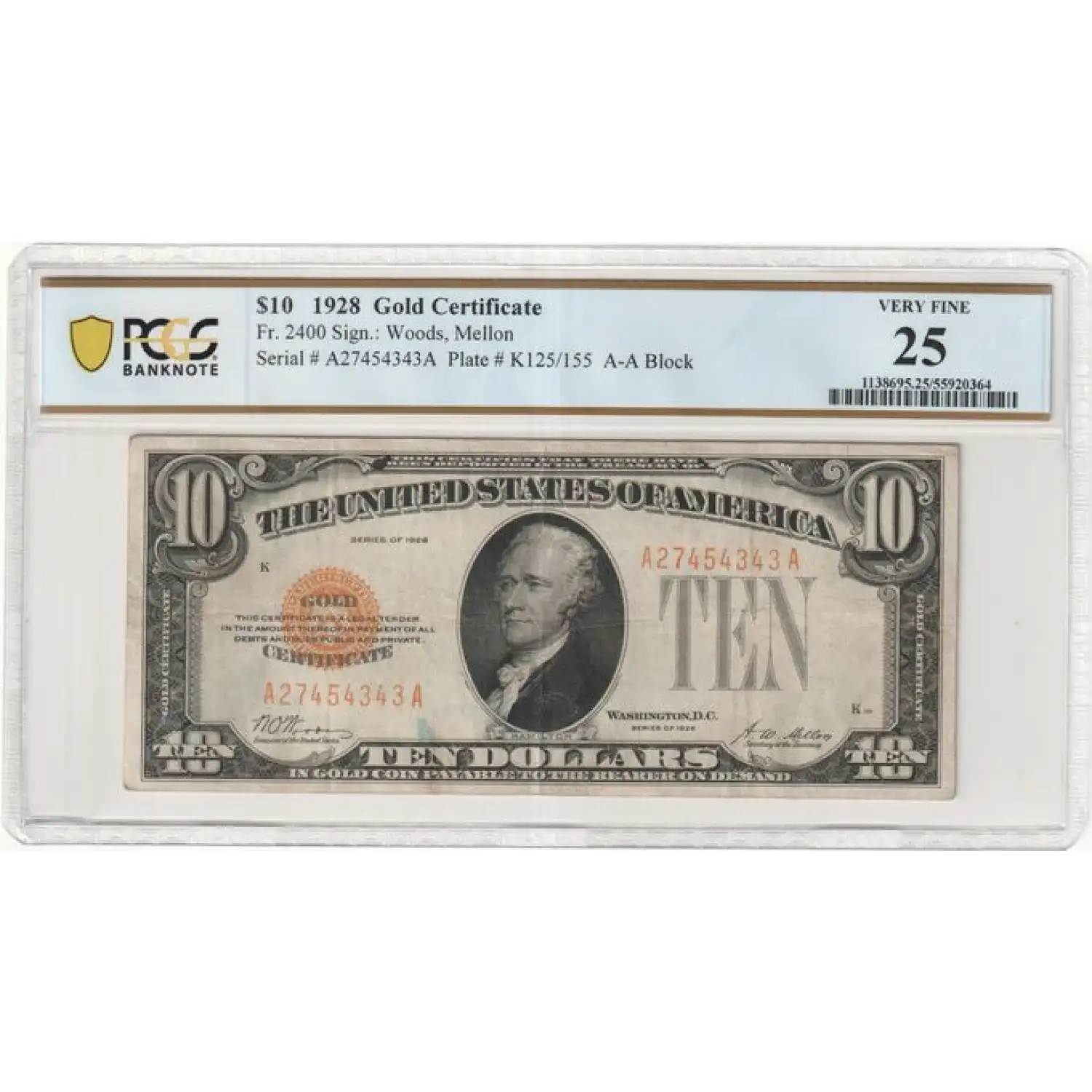 1928 $10 United States Gold Certificate AA Block Fr. 2400- PCGS 25