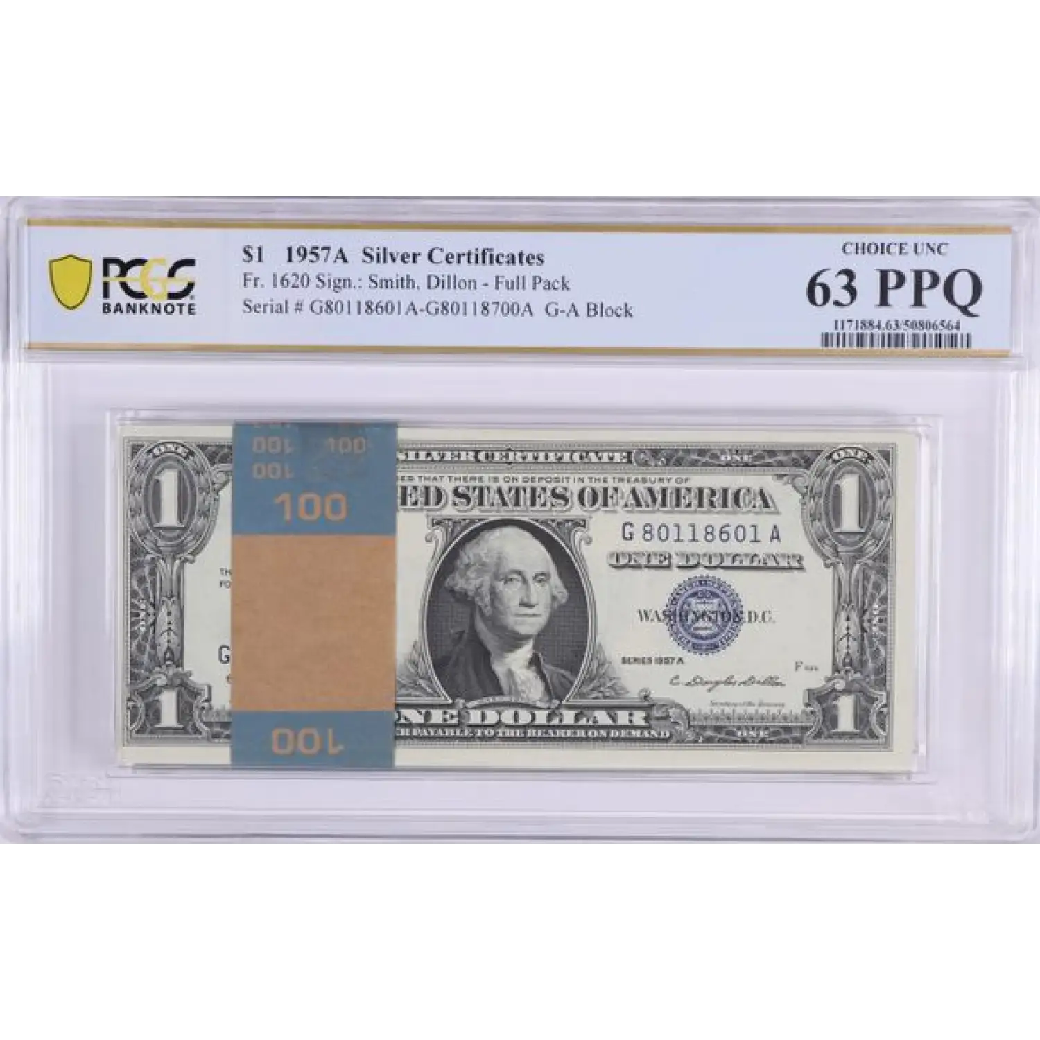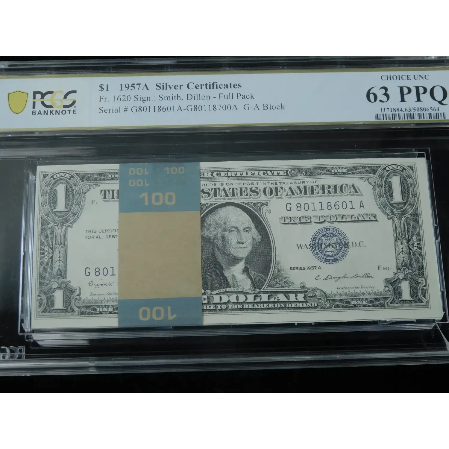1957A $1 US Silver Certificate BEP Pack 100 Consecutive Serial #'s - PCGS 63 PPQ