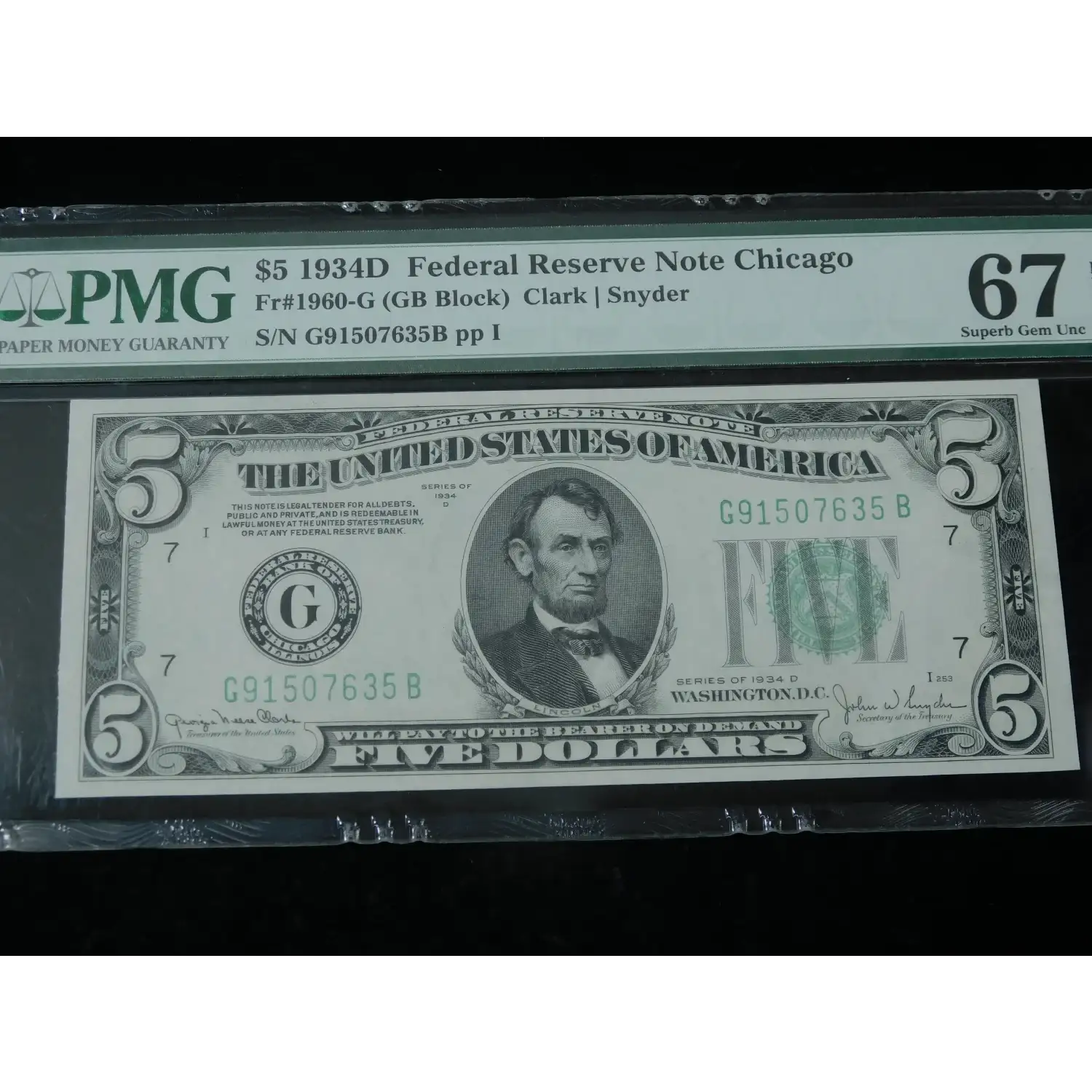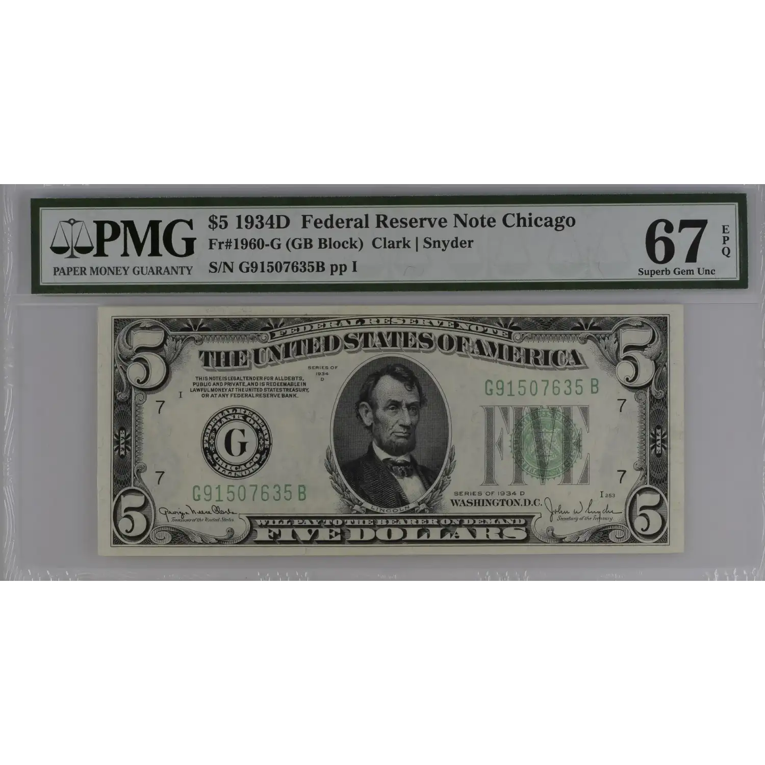 1934 $5 Federal Reserve Note - Chicago Fr. 1960-G - PMG 67 EPQ