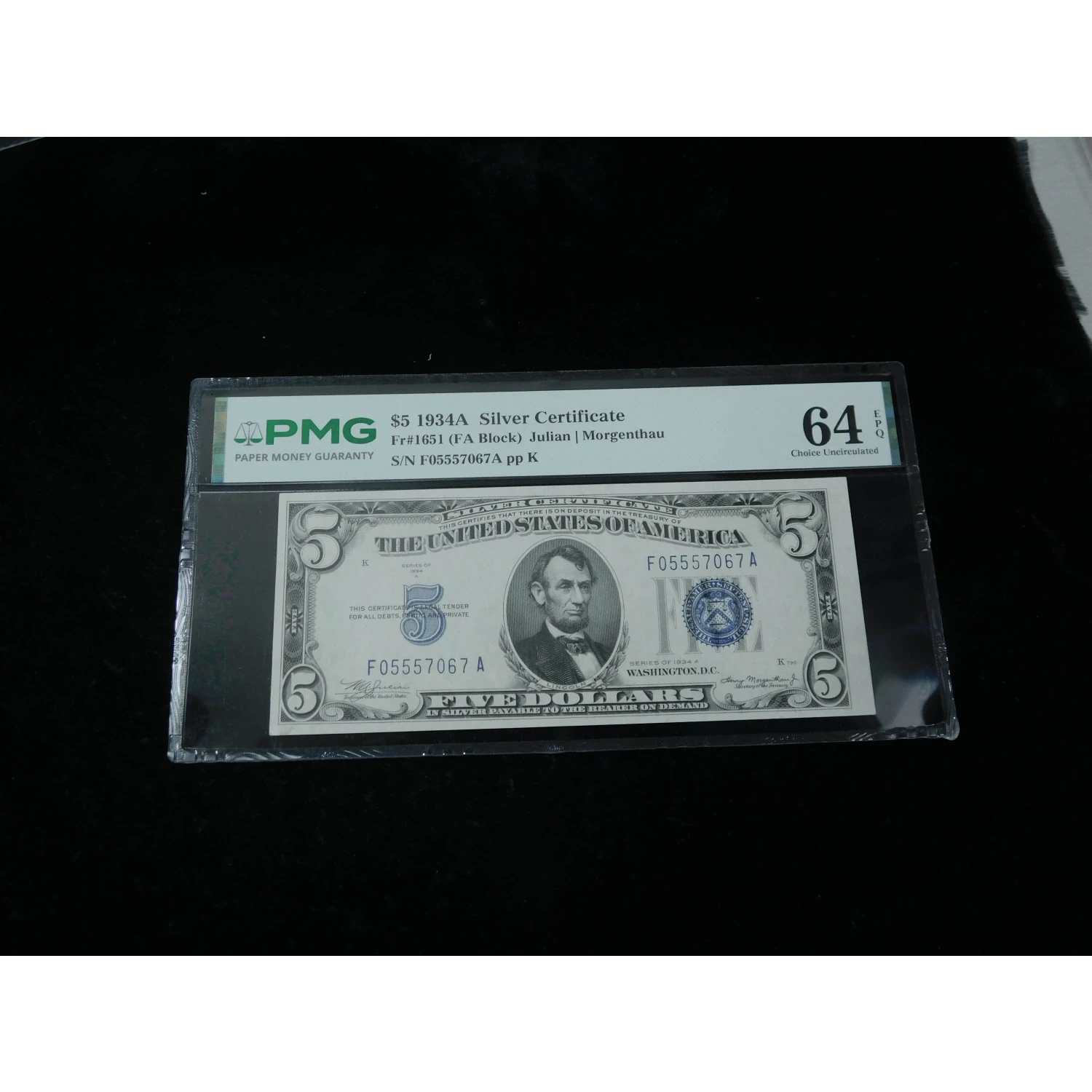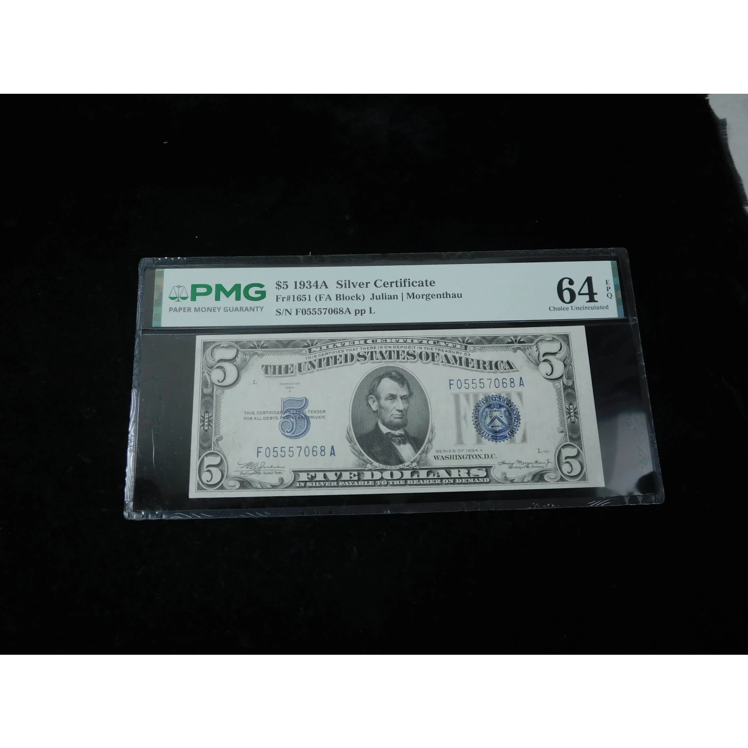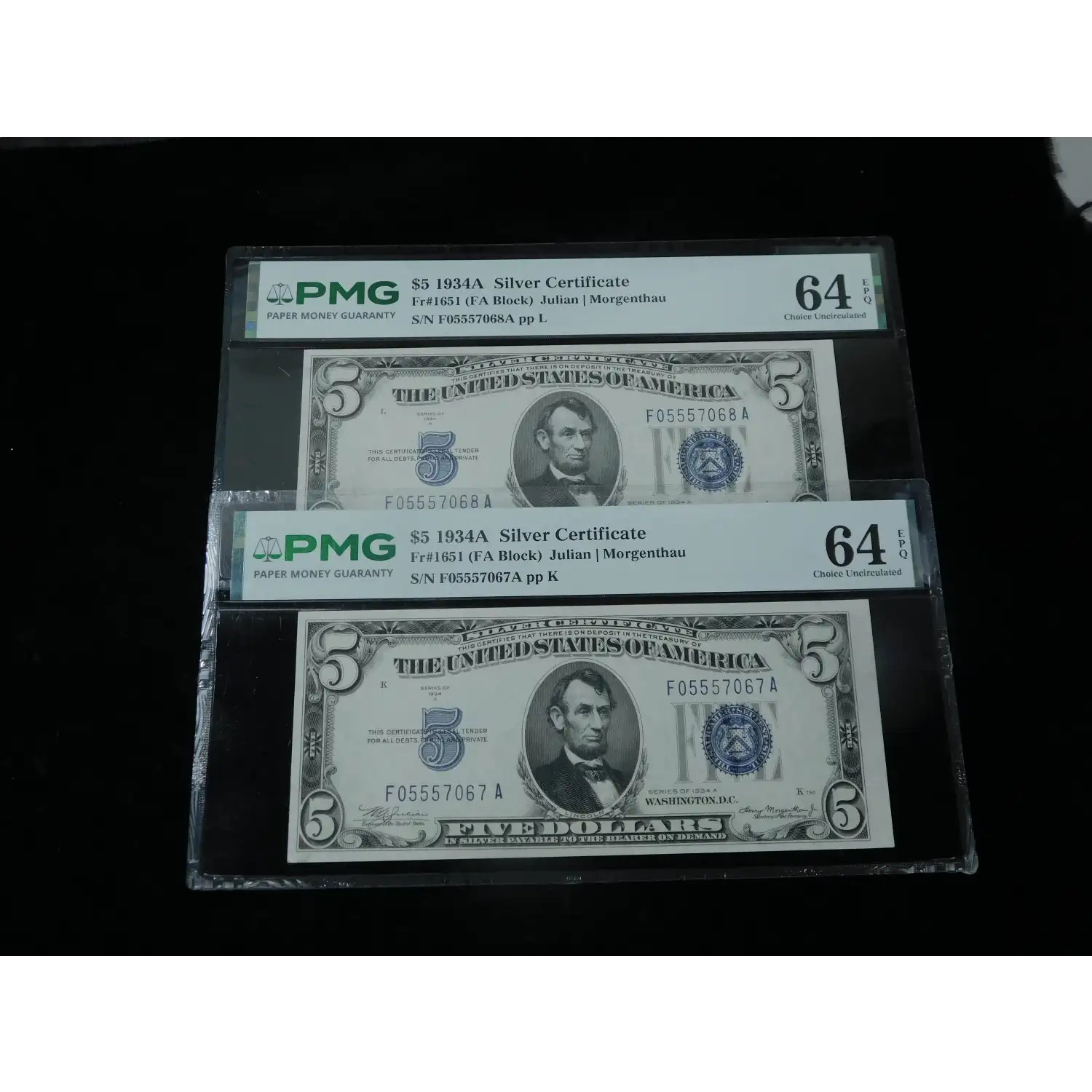 1934 $5 United States Large FIVE Silver Certificates - PMG 64 EPQ - 2 Consecutive Notes