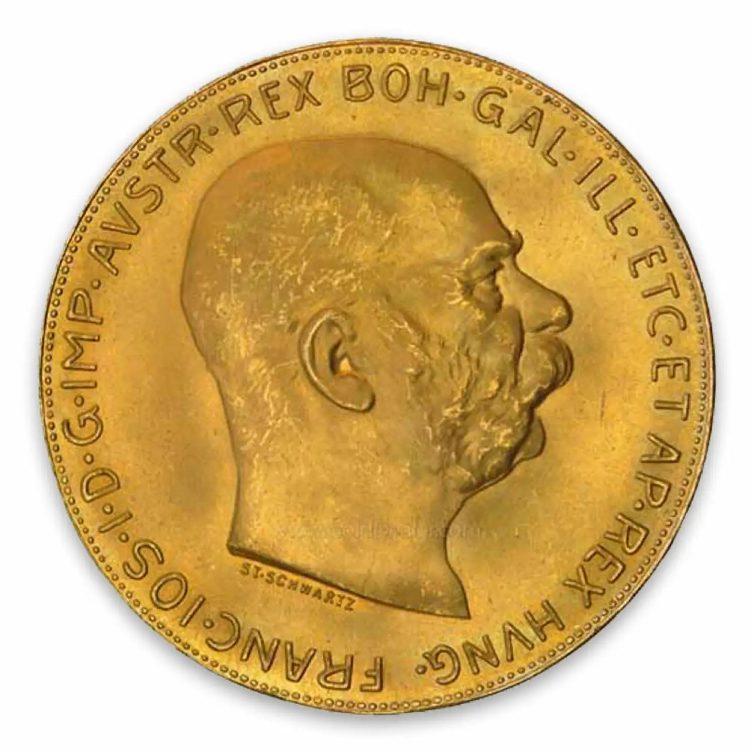 The Obverse of the gold coin features a right facing bust of Franz Joseph I, emperor of Austria-Hungary, surrounded by the legend in Latin. These strikingly beautiful coins are struck by the Austrian Mint.